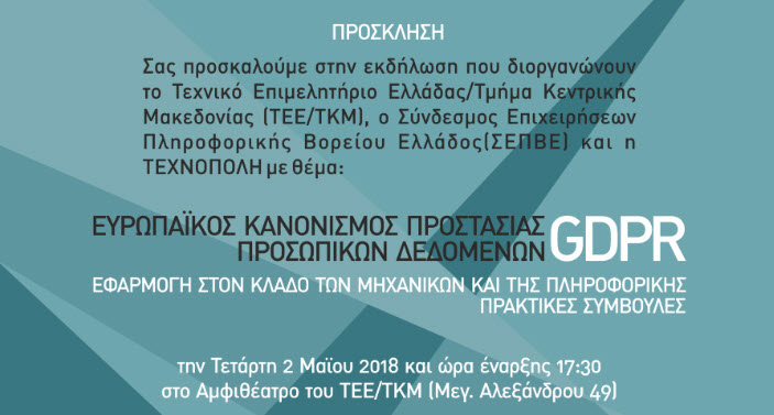 Εκδήλωση με θέμα την εφαρμογή του Ευρωπαϊκού Κανονισμού GDPR στον κλάδο των μηχανικών και της Πληροφορικής – Πρακτικές Συμβουλές.