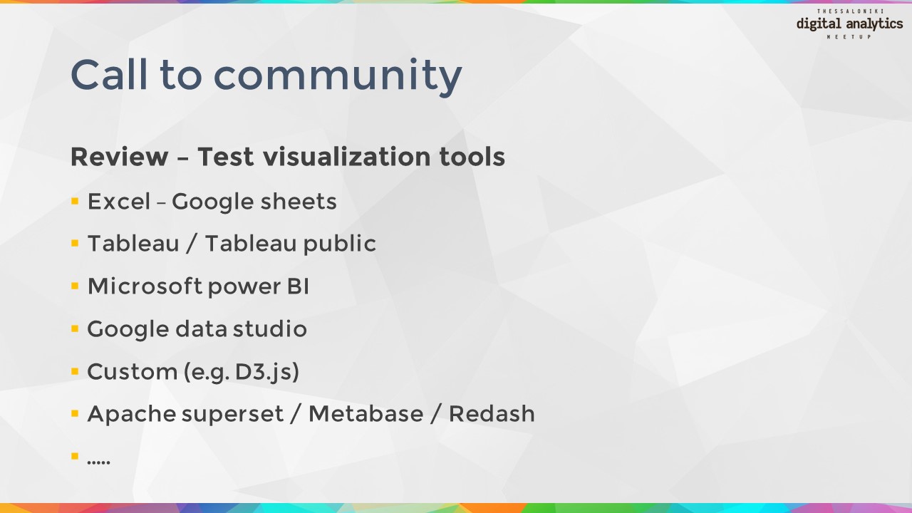 Όπως είπαμε κατά την διάρκεια της τελευταίας συνάντησης θέλουμε να κάνουμε ένα workshop στο οποίο θα γνωρίσουμε όλοι μαζί καλύτερα εργαλεία οπτικοποίησης δεδομένων (visualization tools). Για αυτό το λόγο κάνουμε ανοιχτό κάλεσμα στην κοινότητα για να συμμετέχει και αυτή ενεργά στην συγκεκριμένη προσπάθεια. Όποιος έχει γνώση ή απλά όρεξη να ασχοληθεί με κάποιο από τα παρακάτω εργαλεία ή με κάποιο άλλο που λείπει από την λίστα, μπορεί να επικοινωνήσει μαζί μας για να οργανώσουμε την ομάδα του workshop. Στείλτε μας τα στοιχεία επικοινωνίας σας και σχετικά με ποιο εργαλείο ενδιαφέρεστε να ασχοληθείτε. Είναι η πρώτη ευκαιρία που έχουμε να κάνουμε κάτι όλοι μαζί σαν κοινότητα και είμαστε σίγουροι ότι θα έχει καταπληκτικό αποτέλεσμα!